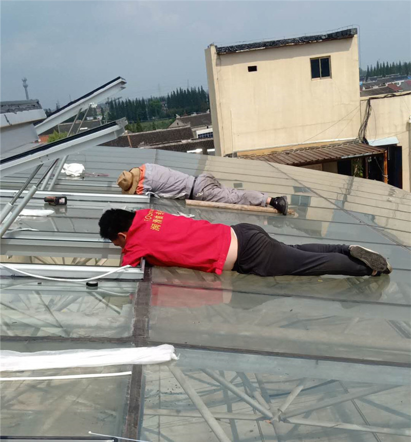 屋面滑、高是現(xiàn)場安裝的主要困難,鑫友售后人員憑借豐富的經(jīng)驗,嫻熟的技能,保證了安裝進度。
