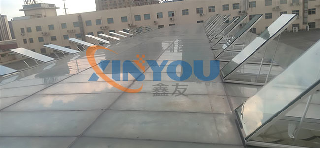 根據(jù)施工圖紙,需先將部分采光玻璃拆除,光滑的玻璃屋面給現(xiàn)場施工增加了難度。現(xiàn)場環(huán)境不允許大型作業(yè)車入場作業(yè),鑫友售后安裝部員工硬是憑自身力氣將一塊塊玻璃拆除,更換上鑫友電動排煙窗。