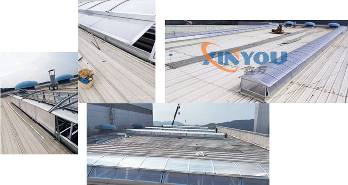 2. 圓拱型電動采光排煙天窗主要材料通常采光不同規格的鋁型材,采光材料一般使用PC陽光板或FRP采光板,天窗頂部為拱型,其好處是可以折射陽光擴大室內采光面積,且拱型的窗面利于夏季排雨,冬季又不易積雪,本身的自潔性較好,表面浮塵雨水沖刷,經常保持較好的采光效果。