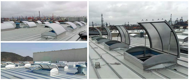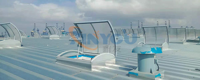 圓拱形的設計,外觀美觀大氣,能更好的防水,同時有效減少風壓阻力,天窗頂部為采光板,有效增加室內亮度,開啟電機設計成24V電壓,可連接消防聯動控制系統及風、雨、煙感應器。***開啟角度為45°。