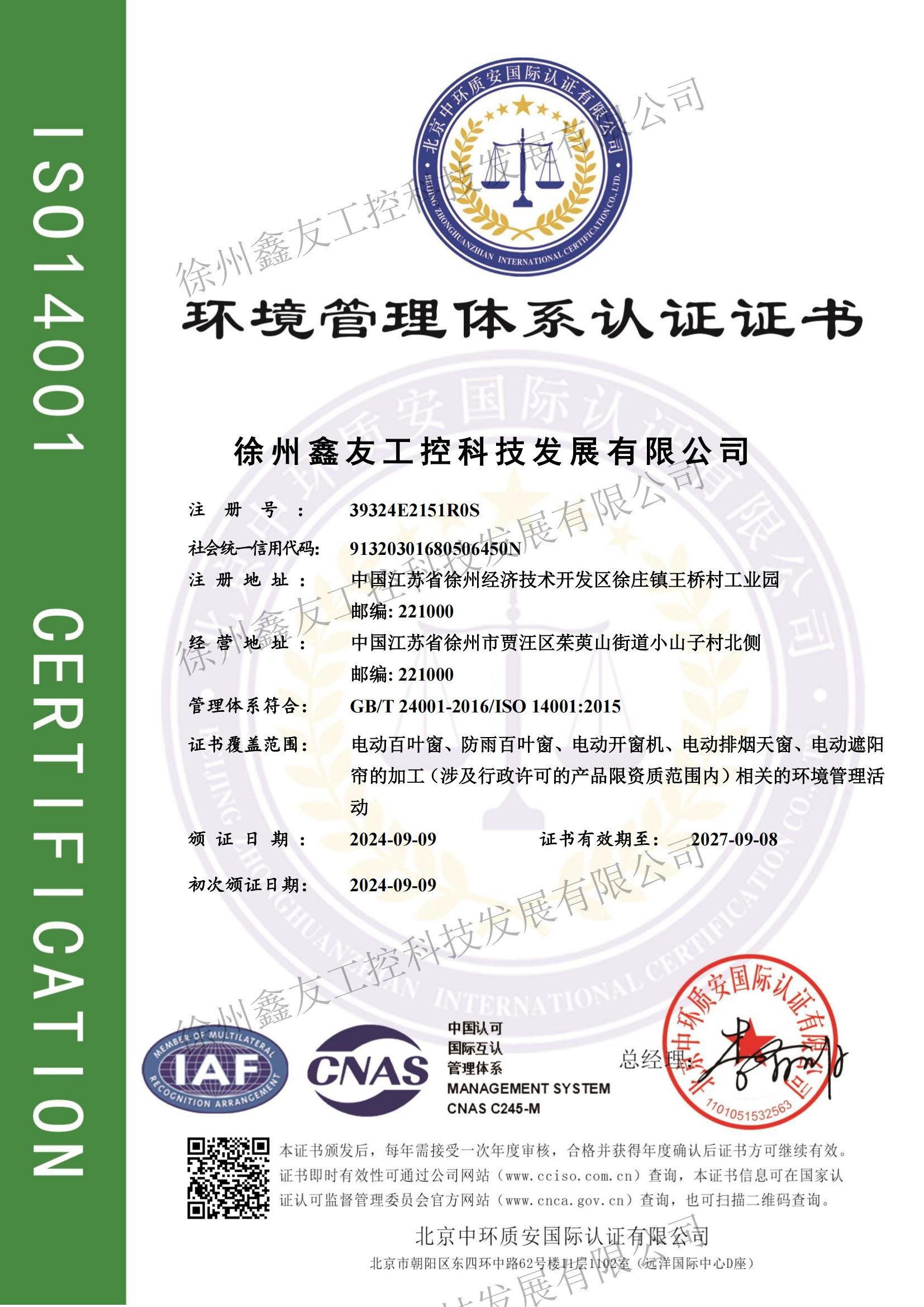 環境管理體系認證證書