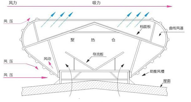 風壓作用:當風從廠房頂部吹過,迎風面產生氣壓區,背風面產生負壓區,氣壓的相互作用,使廠房達到通風換氣的目的。