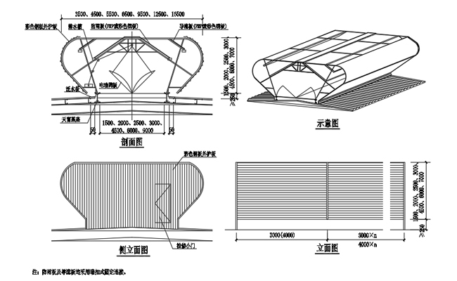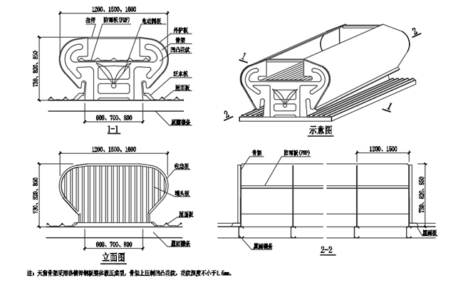 3. 通風天窗側面外護板為彩鋼壓型板,泛水包邊板用彩鋼板折彎而成。